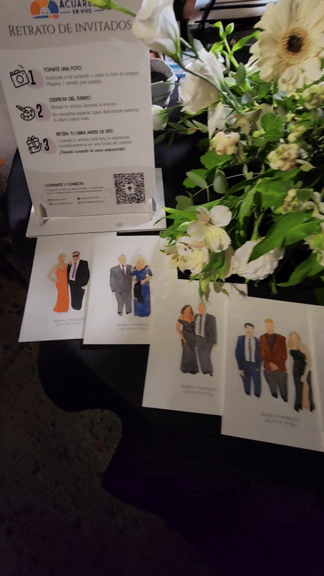 A partir de estas fotos, crearé ilustraciones estilizadas en acuarela en tiempo real, para que tus invitados puedan disfrutar del evento.